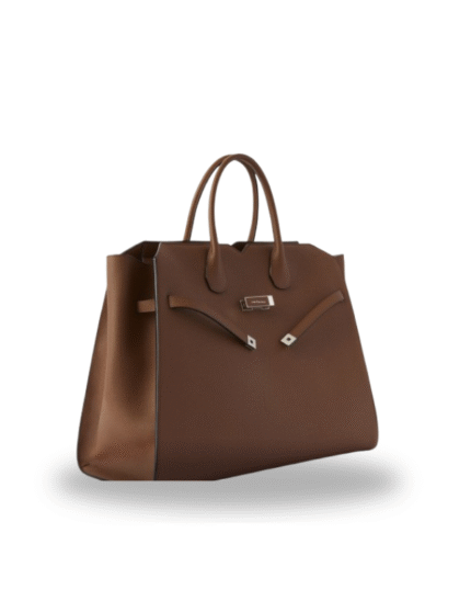 The Hug tote bag receives a masculine refresh with larger dimensions and panels crafted from new washed calfskin featuring a pronounced grain. It retains signature design elements such as wraparound side bands, palladium-finish Gancini buckles, and a keychain charm. The interior is thoughtfully organized to accommodate personal essentials and electronic devices. Designed for versatile carry, it can be worn by hand or over the shoulder using the removable leather strap.