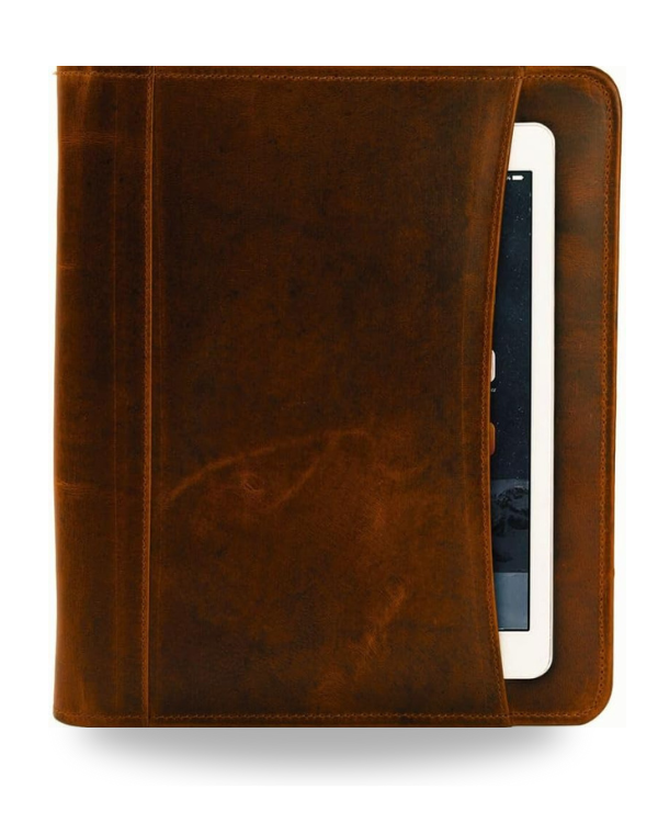 COMPARTMENTS: Thoughtfully organized with multiple storage options, it includes 1 large inner pocket for MacBook/Tablet, 1 zipper pocket, 1 spacious document sleeve, 4 business card slots, 1 ID slot, 3 pen holders, a mobile/calculator pocket, a document protector, and a notepad holder. An additional outer sleeve offers easy access for your iPad/Tablet. All contents—digital and paper—are securely protected with a heavy-duty wrap-around zipper.