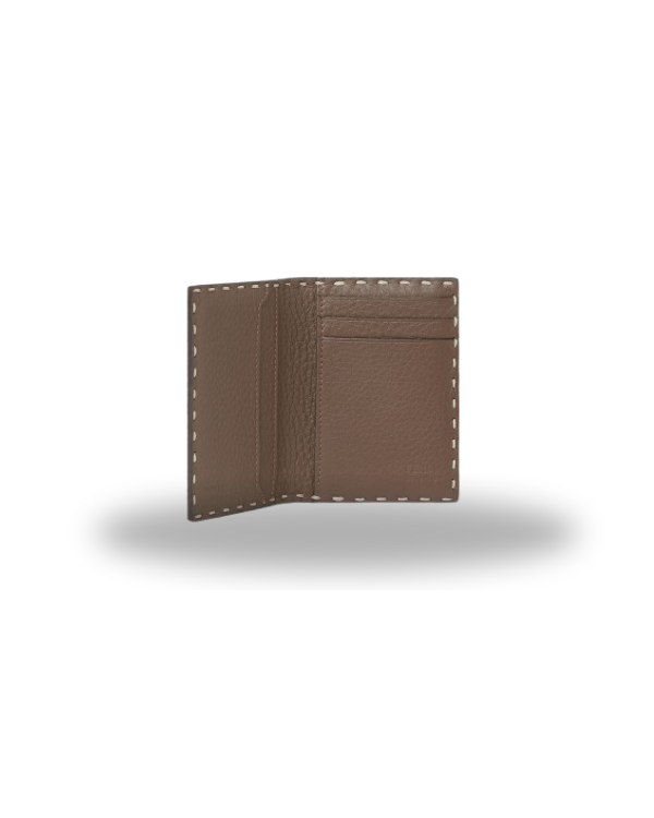 Compact bi-fold card holder crafted from light brown Cuoio Romano leather, detailed with 104 contrasting hand-stitched macro topstitches—a hallmark of the iconic Selleria craftsmanship passed down through Fendi artisans since 1925. Designed with three card slots, three internal flat pockets, and an additional flat pocket on the back. Finished with a brown Cuoio Romano leather lining and palladium-finish metalware. Made in Italy.