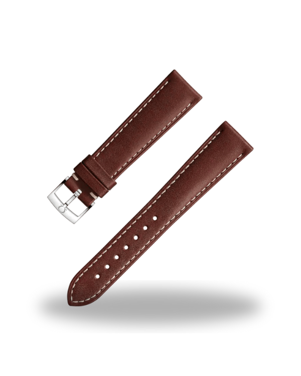Brown leather watch strap accented with beige stitching and a classic pin buckle.